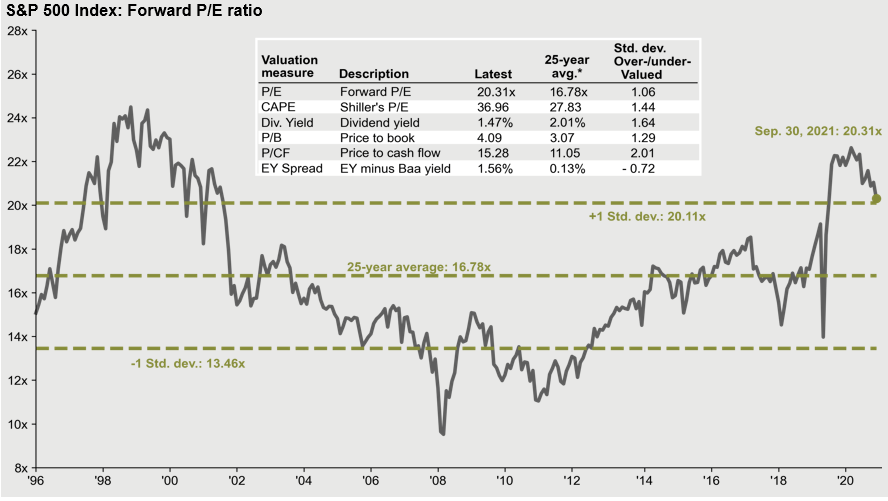 Source: FactSet, FRB, Robert Shiller, Standard & Poor’s, Thomson Reuters, J.P. Morgan Asset Management. Price-to-earnings is price divided by consensus analyst estimates of earnings per share for the next 12 months as provided by IBES since September 1996, and J.P. Morgan Asset Management for September 30, 2021. Current next 12-months consensus earnings estimates are $214. Average P/E and standard deviations are calculated using 25 years of IBES history. Shiller’s P/E uses trailing 10-years of inflation-adjusted earnings as reported by companies. Dividend yield is calculated as the next 12-months consensus dividend divided by most recent price. Price-to-book ratio is the price divided by book value per share. Price-to-cash flow is price divided by NTM cash flow. EY minus Baa yield is the forward earnings yield (consensus analyst estimates of EPS over the next 12 months divided by price) minus the Moody’s Baa seasoned corporate bond yield. Std. dev. over-/under-valued is calculated using the average and standard deviation over 25 years for each measure. *P/CF is a 20-year average due to cash flow availability. Guide to the Markets – U.S. Data are as of September 30, 2021.