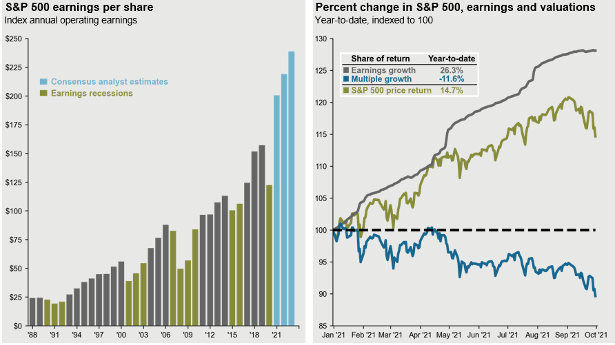 Source: FactSet, Compustat, Standard & Poor’s, J.P. Morgan Asset Management. Historical EPS levels are based on annual operating earnings per share. Earnings estimates are based on estimates from Standard & Poor’s and FactSet Market Aggregates. Past performance is not indicative of future returns. Guide to the Markets – U.S. Data are as of September 30, 2021.