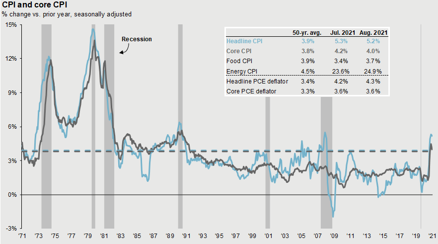 Source: BLS, FactSet, J.P. Morgan Asset Management.CPI used is CPI-U and values shown are % change vs. one year ago. Core CPI is defined as CPI excluding food and energy prices. The Personal Consumption Expenditure (PCE) deflator employs an evolving chain-weighted basket of consumer expenditures instead of the fixed-weight basket used in CPI calculations. Guide to the Markets – U.S. Data are as of September 30, 2021.