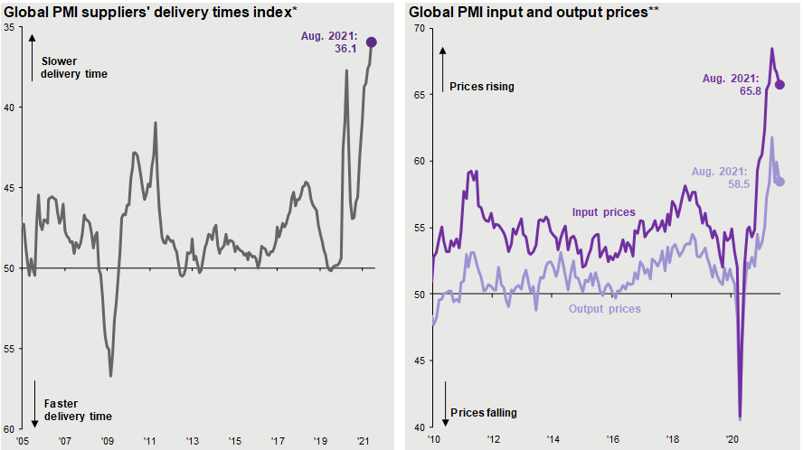 Source: IHS Markit, J.P. Morgan Asset Management. *Participants in IHS Markit’s PMI business surveys, conducted in 44 countries, are asked: “Are your suppliers’ delivery times slower, faster or unchanged on average than one month ago?“. Index includes the manufacturing and construction sectors. A reading of 50 = no change, >50 = faster delivery time, <50 = slower delivery time.**Participants are asked: “Are input/output prices the same, higher or lower?”. Values shown reflect the composite index which includes both manufacturing and services. A reading of 50 = no change, >50 = price increase, <50= price decrease. Guide to the Markets – U.S. Data are as of September 30, 2021.
