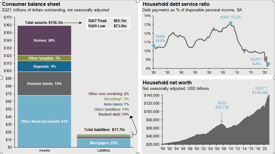 Source: FactSet, FRB, J.P. Morgan Asset Management; (Top and bottom right) BEA. Data include households and nonprofit organizations. SA – seasonally adjusted. *Revolving includes credit cards. Values may not sum to 100% due to rounding. **3Q21 figures for debt service ratio and household net worth are J.P. Morgan Asset Management estimates. Guide to the Markets – U.S. Data are as of September 30, 2021.