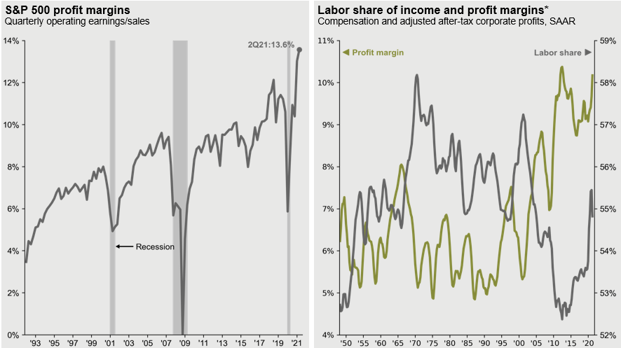 Source: BEA, Compustat, FactSet, Standard & Poor’s, J.P. Morgan Asset Management. Past performance is not indicative of future returns. *Labor share of income and profit margins are shown on a 4-quarter moving average basis. Guide to the Markets – U.S. Data are as of September 30, 2021