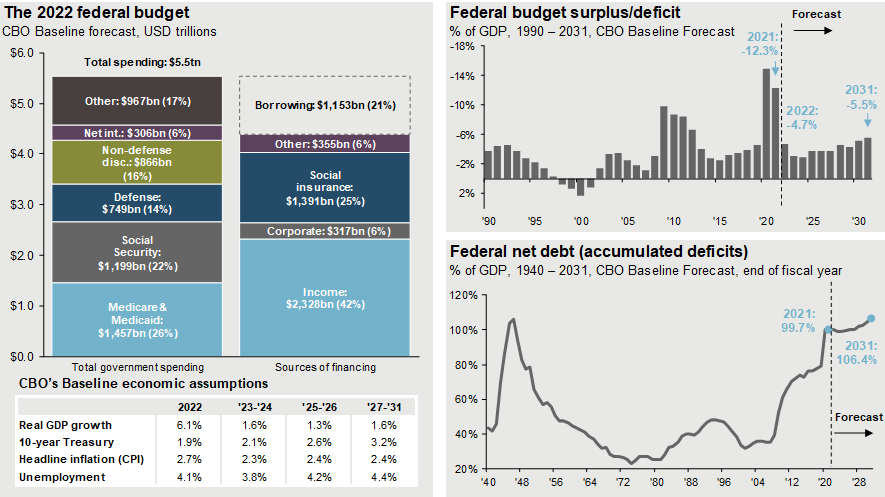 Source: CBO, J.P. Morgan Asset Management; (Top and bottom right) BEA, Treasury Department. Estimates are based on the Congressional Budget Office (CBO) July 2021 Update to the Budget and Economic Outlook, except for 2021 estimates of the federal deficit and net debt levels. These estimates and the details on the breakdown of spending, excluding net interest, are J.P. Morgan Asset Management estimates. Other spending includes, but is not limited to, health insurance subsidies, income security and federal civilian and military retirement. Note: Years shown are fiscal years. Forecasts are not a reliable indicator of future performance. Forecasts, projections and other forward-looking statements are based upon current beliefs and expectations. They are for illustrative purposes only and serve as an indication of what may occur. Given the inherent uncertainties and risks associated with forecasts, projections or other forward-looking statements, actual events, results or performance may differ materially from those reflected or contemplated. Guide to the Markets – U.S. Data are as of September 30, 2021.