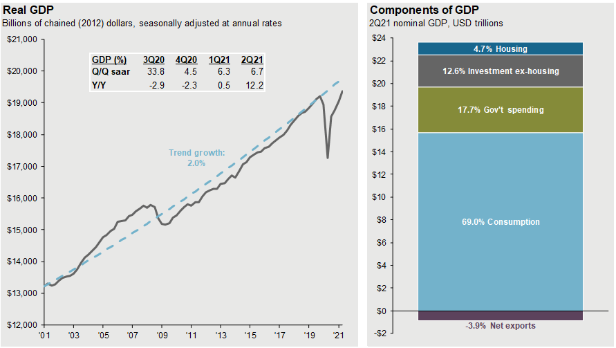 Source: BEA, FactSet, J.P. Morgan Asset Management. Values may not sum to 100% due to rounding. Trend growth is measured as the average annual growth rate from business cycle peak 1Q01 to business cycle peak 4Q19. Guide to the Markets – U.S. Data are as of September 30, 2021.