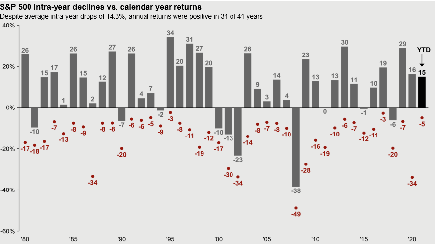 Source: FactSet, Standard & Poor’s, J.P. Morgan Asset Management. Returns are based on price index only and do not include dividends. Intra-year drops refers to the largest market drops from a peak to a trough during the year. For illustrative purposes only. Returns shown are calendar year returns from 1980 to 2020, over which time period the average annual return was 9.0%. Guide to the Markets – U.S. Data are as of September 30, 2021.