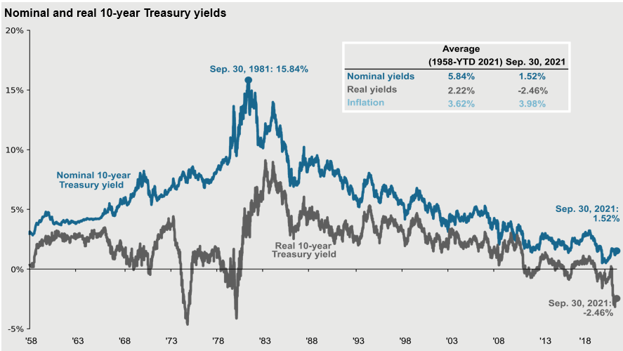 Source: BLS, FactSet, Federal Reserve, J.P. Morgan Asset Management. Real 10-year Treasury yields are calculated as the daily Treasury yield less year-over-year core CPI inflation for that month except for September and August 2021 where real yields are calculated by subtracting out September 2021 year-over-year core inflation. Guide to the Markets – U.S. Data are as of September 30, 2021.