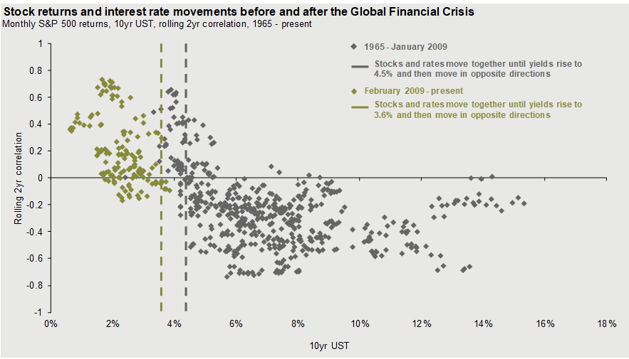 Here is an interesting study of the correlation of interest rate movements and stock prices. When you see a strong correlation, that means that stock prices and treasury yield move together.