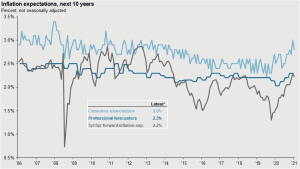 The 5-year forward expectations are what the market is pricing inflation to be. You will notice in this graph that the market and professional forecasters have increased their inflation expectations but are still well below 2.5 %.