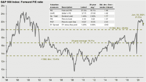 What is interesting about the market’s valuations is that the market, as measured by the S&P 500, is up around 14.4% through July 30, 2021, and yet the P/E ratio has actually gone down.