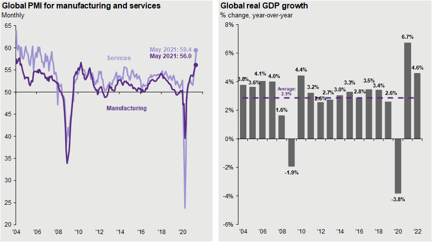 Source: J.P. Morgan Asset Management; (Left) Markit; (Right) J.P. Morgan Global Economic Research. PMI is the Purchasing Managers’ Index. Global GDP growth is a GDP-weighted measure of real GDP at U.S. dollar market exchange rates. 2020, 2021 and 2022 growth rates are forecasts. Forecasts are not a reliable indicator of future performance. Forecasts, projections and other forward-looking statements are based upon current beliefs and expectations. They are for illustrative purposes only and serve as an indication of what may occur. Given the inherent uncertainties and risks associated with forecasts, projections or other forward statements, actual events, results or performance may differ materially from those reflected or contemplated. Guide to the Markets – U.S. Data are as of June 30, 2021.