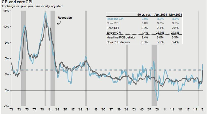 Source: BLS FactSet: JP Morgan Asset Management CPI used is CPI-U and values shown here are % change vs. one year ago. Core CPI is defined as CPI excluding food and energy prices. The Personal Consumption Expenditure (PCE) deflator employs an evolving chain-weighted basket of consumer expenditures instead of the fixed-weight basket used in CPI calculations. Guide to the Markets – U.S. Data are as of June 30, 2021