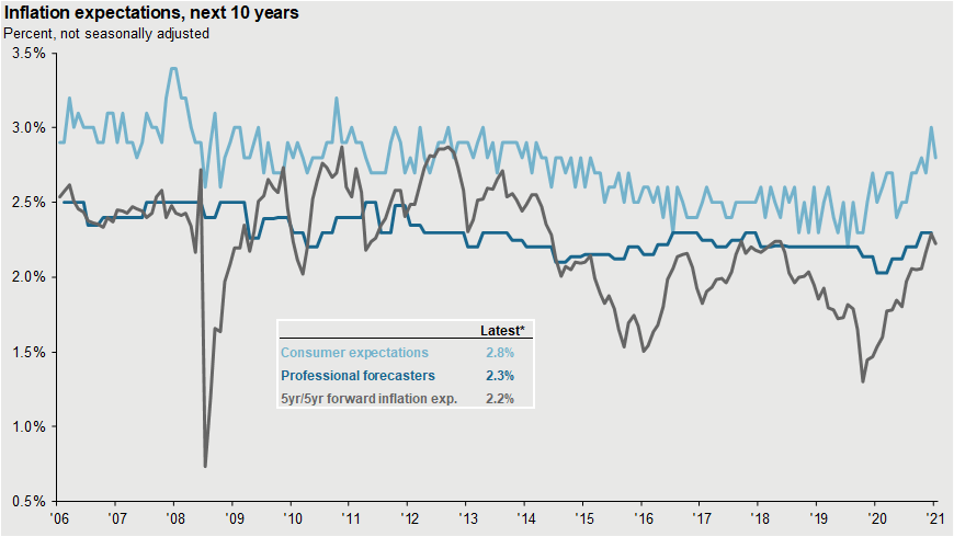 The 5-year forward expectations are what the market is pricing inflation to be. You will notice in this graph that the market and professional forecasters have increased their inflation expectations but are still well below 2.5 %.