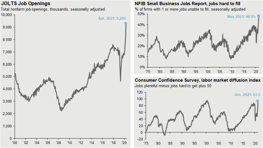 Source: Conference Board, National Federation of Independent Business, U.S. Department of Labor, J.P. Morgan Asset Management. The diffusion index is calculated as the percentage of consumers reporting jobs plentiful minus those reporting jobs hard to get plus 50. Guide to the Markets – U.S. Data are as of June 30, 2021