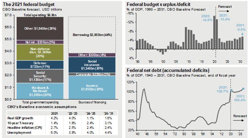 Source: CBO, J.P. Morgan Asset Management (Top and bottom right) BEA, Treasury Department. Estimates are based on the Congressional Budget Office (CBO) July 2021. Update to the Budget and Economic Outlook. Details on the breakdown of spending, excluding net interest, are J.P. Morgan Asset Management estimates. Other spending includes, but is not limited to health insurance subsidies, income security, and federal civilian and military retirement. Note: Years shown are fiscal years. Forecasts are not a reliable indicator of future performance. Forecasts, projections, and other forward-looking statements are based upon current beliefs and expectations. They are for illustrative purposes only and serve as an indication of what may occur. Given the inherent uncertainties and risks associated with forecasts, projections and other forward statements, actual events, results, or performance may differ materially from those reflected or contemplated. Guide to the Markets – U.S. Data are as of June 30, 2021.