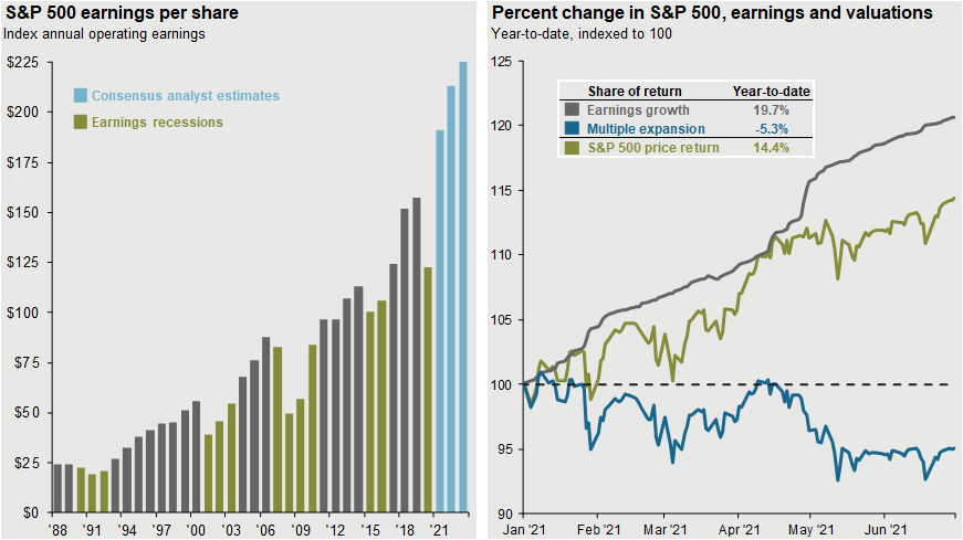 Source: FactSet, Compustat, Standard & Poor’s, J.P. Morgan Asset Management Historical EPS levels are based on annual operating earnings per share. Earnings estimates are based on estimates from Standard & Poor’s and FactSet Market Aggregates. Past performance is not indicative of future returns. Guide to the Markets – U.S. Data are as of June 30, 2021
