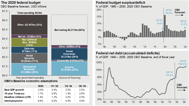 Source: CBO, J.P. Morgan Asset Management; (Top and bottom right) BEA, Treasury Department. 2020 Federal Budget is based on the Congressional Budget Office (CBO) September 2020 Baseline Budget Forecast. CBO Baseline economic assumptions are based on the Congressional Budget Office (CBO) July 2020 Update to Economic Outlook. Guide to the Markets – U.S. Data are as of September 30, 2020.