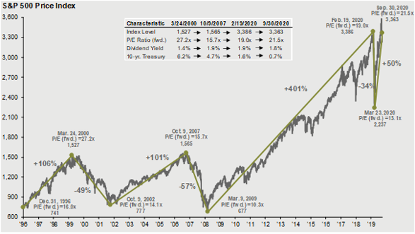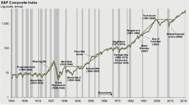 Source: FactSet, NBER, Robert Shiller, J.P. Morgan Asset Management. Data shown in log scale to best illustrate long-term index patterns. Past performance is not indicative of future returns. Chart is for illustrative purposes only. Guide to the Markets – U.S. Data are as of September 30, 2020.