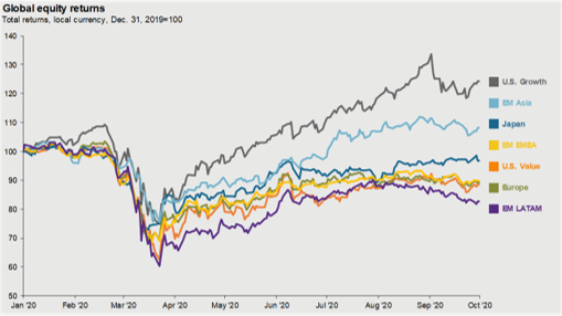 Source: FactSet, FTSE Russell, MSCI, J.P. Morgan Asset Management. Growth is represented by the Russell 1000 Growth Index and Value is represented by the Russell 1000 Value Index. Guide to the Markets – U.S. Data are as of September 30, 2020.