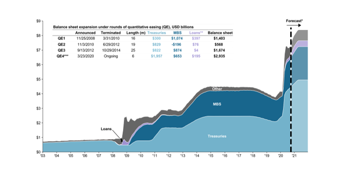 Source: FactSet, Federal Reserve, J.P. Morgan Investment Bank, J.P. Morgan Asset Management. Currently, the balance sheet contains $4.4 trillion in Treasuries and $2.0 trillion in MBS. The end balance forecast is $5.4 trillion in Treasuries and $2.5 trillion in MBS by December 2021. Guide to the Markets – U.S. Data are as of September 30, 2020.