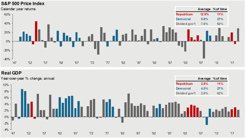 Source: FactSet, Office of the President, J.P. Morgan Asset Management; (Top) Standard & Poor’s; (Bottom) Bureau of Economic Analysis. Top chart shows S&P 500 price returns. Guide to the Markets – U.S. Data are as of September 30, 2020.