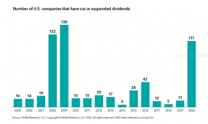 Covid-19 has decimated the revenues of thousands of companies. Some great companies like Boeing and Disney have cut or eliminated their dividends to preserve cash so they can survive. The charge below shows the number of U.S. companies that have cut their dividends this year, up over 1000% from 2019.